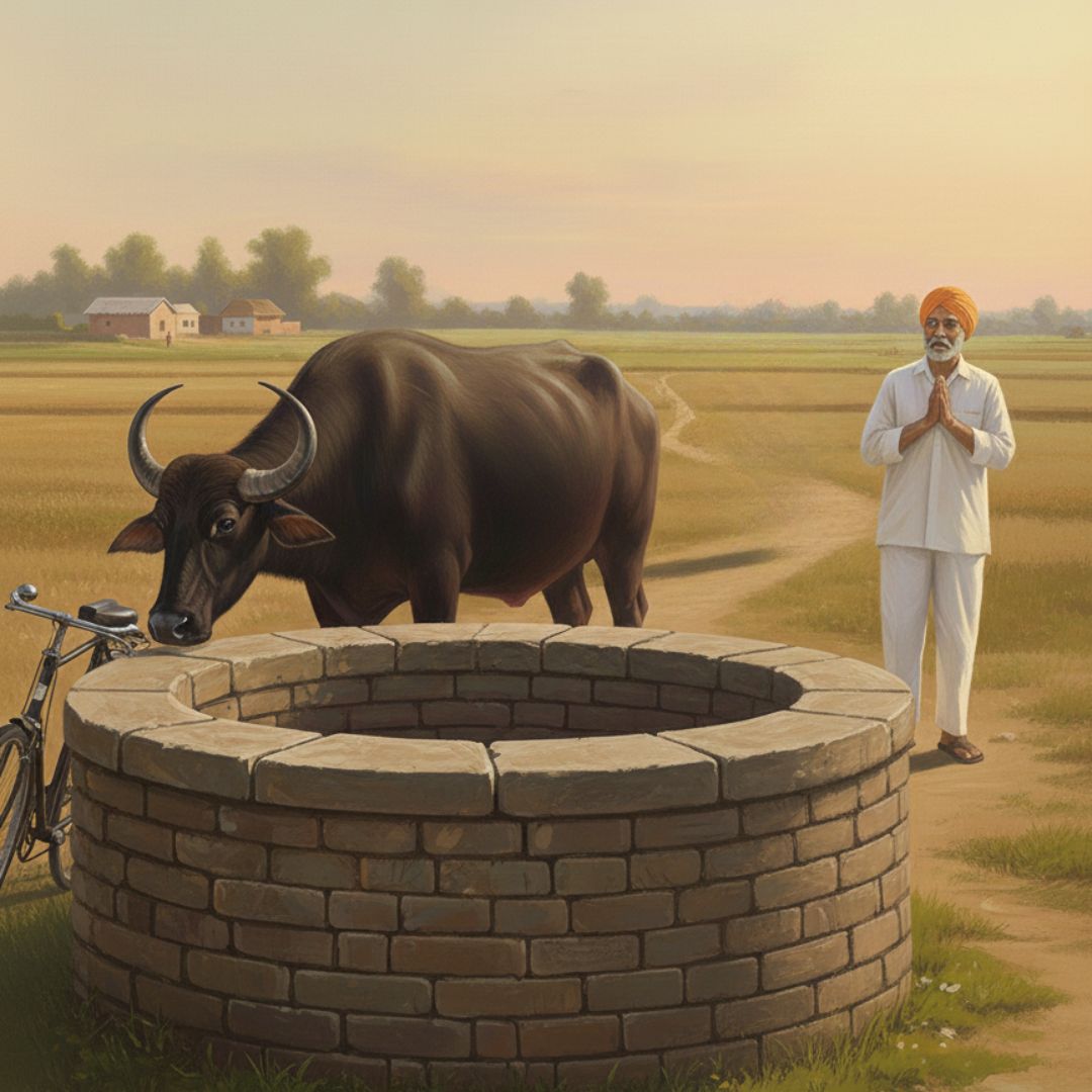 Jagdeep placed Guru Ji on the back seat of his bicycle and pedaled toward the well. The villagers were already gathered there, whispering mockingly, “Look, look! Jagdeep and his Baba have come. Now let’s see if he can get the buffalo out.”