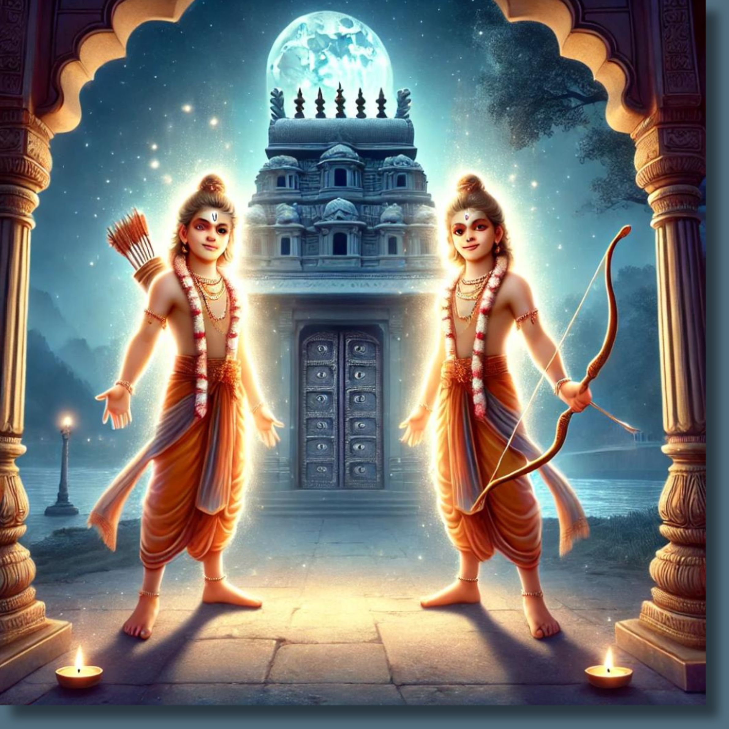 Curious and still shaken, they asked Tulsi Das ji, “Who are those two radiant young men guarding your scripture? They looked like kings from somewhere. How did you get them to protect the Ramayan for you? We saw them at each door, two at one entrance and two at another. Who are they? Their divine presence has left us sleepless all night.”